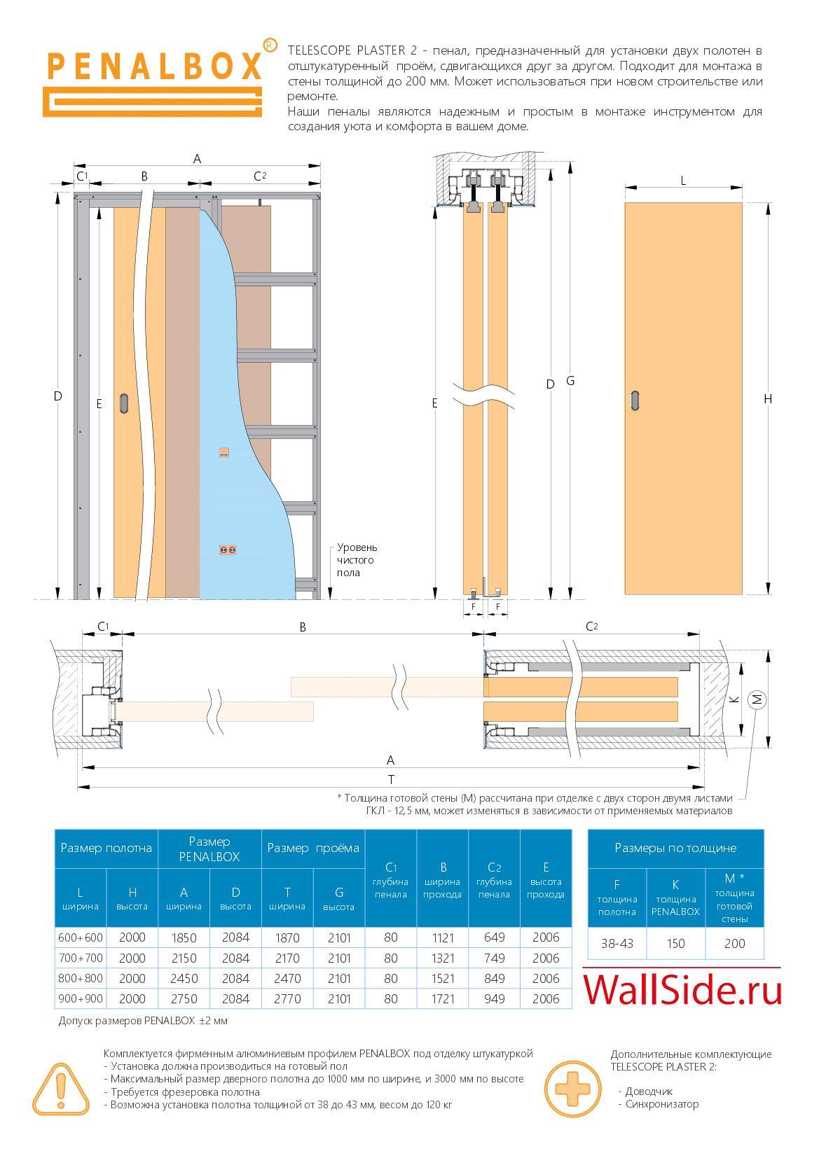 Телескопический пенал для межкомнатных дверей. Состоит из комплекта на 2 полотна, попарно сдивгающихся в одну сторону. Используется фурнитура собственного производства, бесшумные ролики на подшипниках.