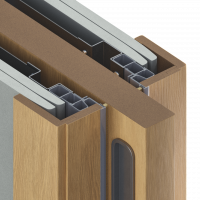 Пенал для двухстворчатой раздвижной двери с наличниками, комплектация для полотен высотой до 2,4 м. Под отделку гипсокартоном. Подходит для деревянных дверей весом до 80 кг, возможно усиление роликами на 130 кг. Предусмотрена версия с двухсторонним доводчиком или без него, а также, версия с механизмом синхронного открывания.