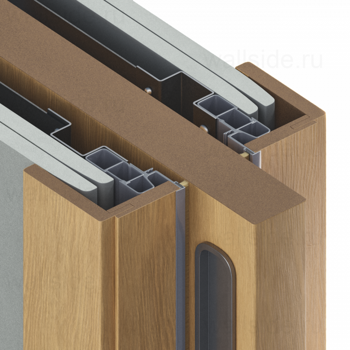 Пенал для двухстворчатой раздвижной двери с наличниками, комплектация для полотен высотой до 2,7 м. Под отделку гипсокартоном. Подходит для деревянных дверей весом до 80 кг, возможно усиление роликами на 130 кг. Предусмотрена версия с двухсторонним доводчиком или без него, а также, версия с механизмом синхронного открывания.