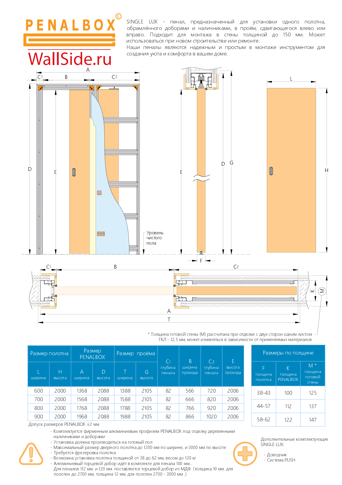 Пенал для одностворчатой двери высотой до 2,7 метров, комплект с фурнитурой. Высота регулируется путём подрезки вертикальных стоек. Под отделку гипсокартоном. Грузоподъёмность до 80 кг, возможна комплектация усиленными роликами до 130 кг. Предусмотрена версия с двухсторонним доводчиком или без него, а также механизм пуш.