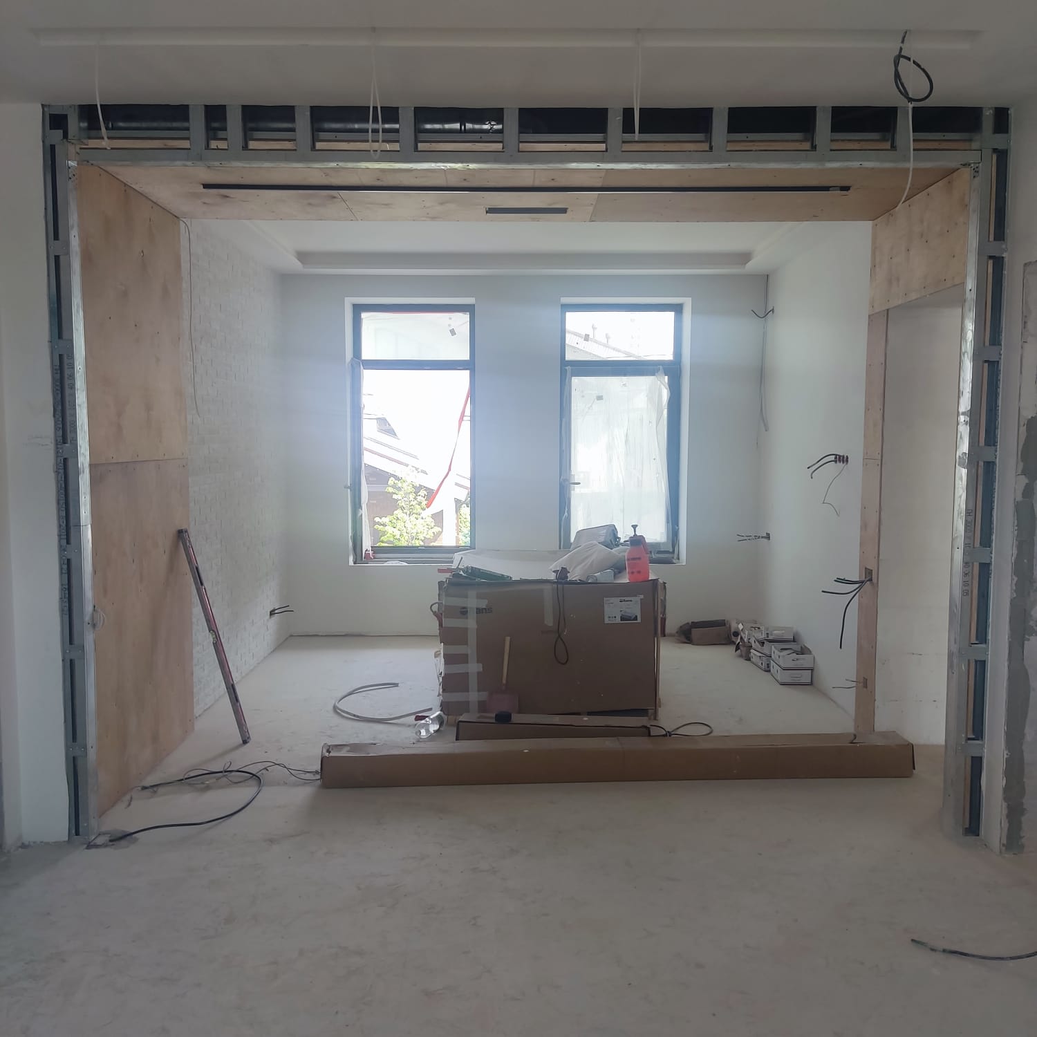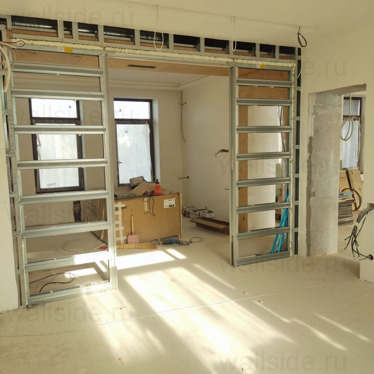 1. Межкомнатное пространство оказалось великовато, поэтому проём заузили с помощью простенков из профиля по бокам и сверху.